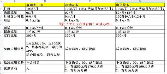 看下我为大家精心整理的表格,现在市面上比较划算的流量卡大概就是这三种:联通大王卡、移动花卡、电信星卡。