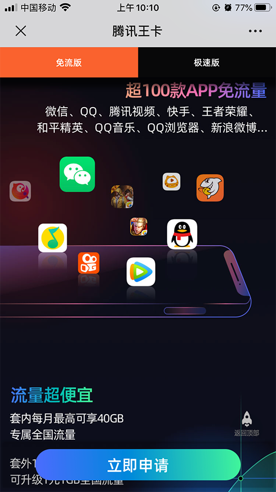 腾讯王卡流量套餐相关合同条款描述为 :“当月套餐上网流量累积使用达40GB时,系统将关闭上网功能”。按照字面理解,当套餐流量累积使用达40GB时,系统才关闭上网功能。